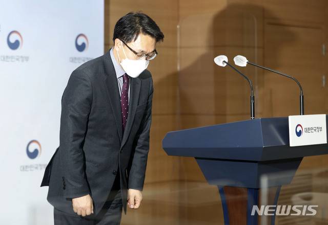 [서울=뉴시스]홍효식 기자 = 김진욱 초대 고위공직자범죄수사처(공수처) 처장이 28일 오후 서울 종로구 정부서울청사 브리핑룸에서 헌법재판소 결정 관련 브리핑을 마친 뒤 인사하고 있다. 헌법재판소는 이날 공수처의 설립과 운영 근거를 정한 법률이 헌법에 위배되지 않는다고 판결했다. 2021.01.28. yesphoto@newsis.com