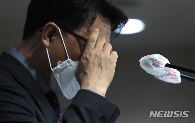 [서울=뉴시스]홍효식 기자 = 김진욱 초대 고위공직자범죄수사처(공수처) 처장이 28일 오후 서울 종로구 정부서울청사에서 헌법재판소 결정 관련 브리핑을 하던 중 안경을 만지고 있다. 헌법재판소는 이날 공수처의 설립과 운영 근거를 정한 법률이 헌법에 위배되지 않는다고 판결했다. (공동취재사진) 2021.01.28. photo@newsis.com