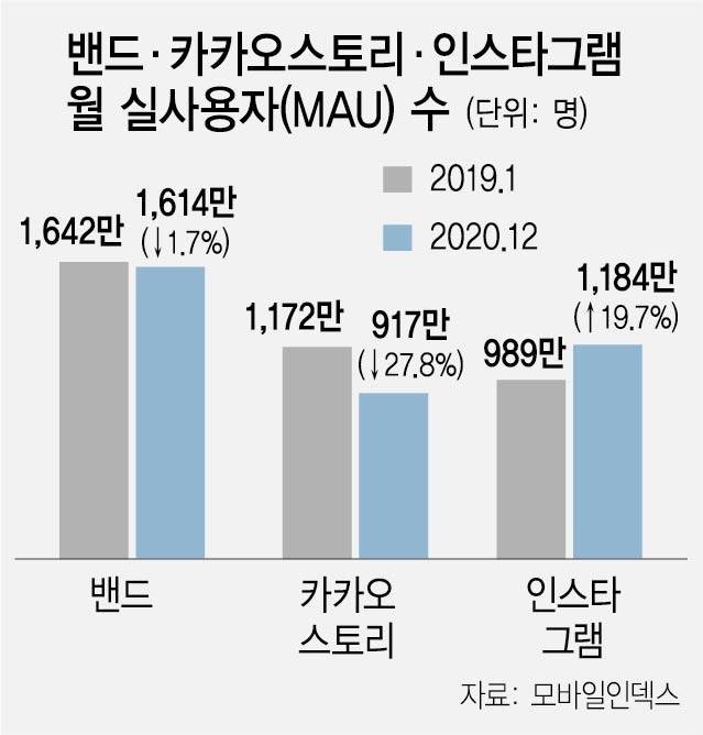 27일 앱 시장조사 업체 아이지에이웍스 ‘모바일인덱스’에 따르면 인스타그램의 월간 실사용자(MAU·안드로이드 기준)는 지난 2019년 1월 989만 명에서 약 2년 만인 지난해 12월 1,184만 명으로 19.7% 늘었다. 같은 기간 네이버 밴드 MAU는 1,642만 명에서 1,614만 명으로 1.7% 소폭 감소했고, 카카오스토리는 1,172만 명에서 917만 명으로 27.8%나 줄었다. 이에 따라 지난 해 12월 MAU 기준 국내 SNS 순위는 밴드·인스타그램·카카오스토리 순으로 카카오스토리가 2위를 인스타그램에 내줬다. 인스타그램의 공세에 밴드는 나름대로 선방한 반면 카카오스토리는 심각한 타격을 입은 것으로 분석된다.