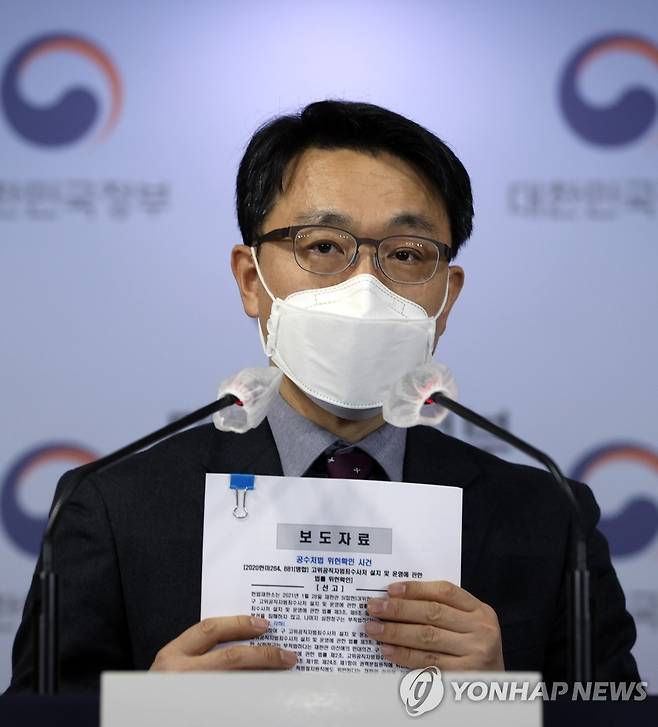 (서울=연합뉴스) 임화영 기자 = 김진욱 고위공직자범죄수사처 처장이 28일 오후 정부서울청사 브리핑실에서 이날 공수처법에 대한 헌재의 합헌 판결에 대한 보도자료를 들고 있다. 2021.1.28