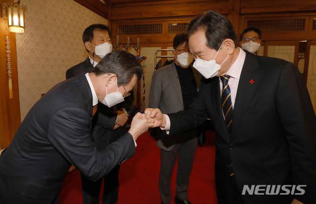 [서울=뉴시스]김병문 기자 = 정세균 국무총리가 28일 오후 서울 종로구 총리공관에서 '코로나19 영업 손실보장, 제도화 방안' 주제로 열린 제34차 목요대화에서 김용범 기획재정부 1차관과 인사를 나누고 있다. (공동취재사진) 2021.01.28. photo@newsis.com