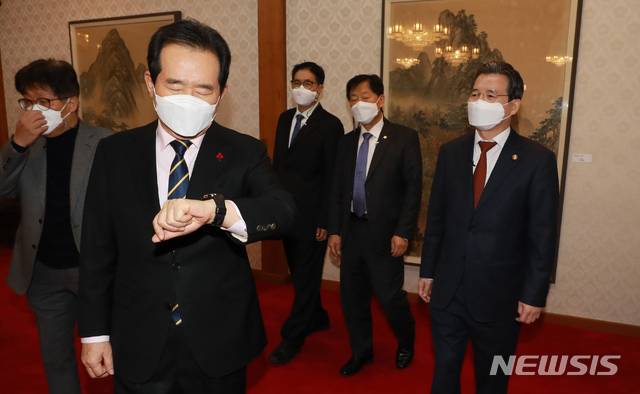 [서울=뉴시스]김병문 기자 = 정세균 국무총리가 28일 오후 서울 종로구 총리공관에서 '코로나19 영업 손실보장, 제도화 방안' 주제로 열린 제34차 목요대화 시작 전 시계를 보고 있다. 오른쪽은 김용범 기획재정부 1차관. (공동취재사진) 2021.01.28. photo@newsis.com