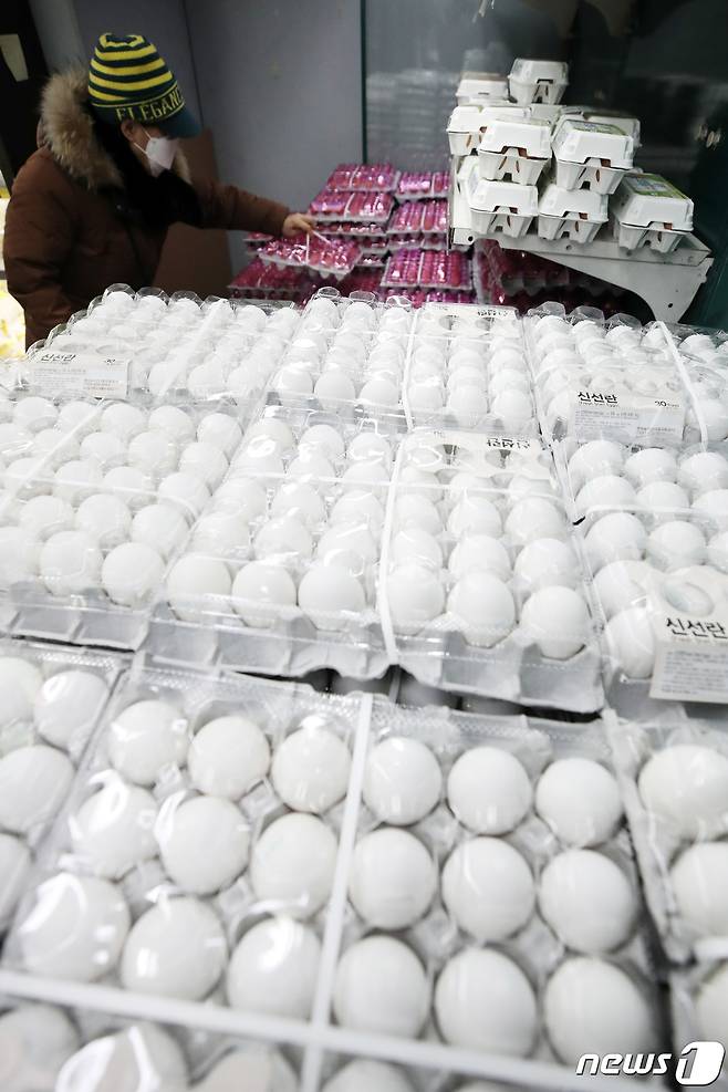 (오산=뉴스1) 조태형 기자 = 28일 경기도 오산시내 한 마트를 찾은 시민이 국내산 계란과 수입산 계란 사이에서 구매를 고민하고 있다. 2021.1.28/뉴스1
