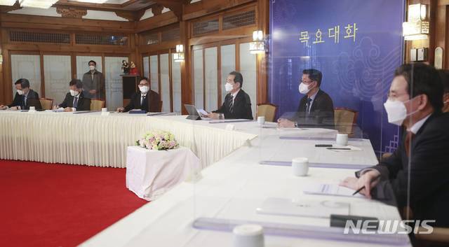 [서울=뉴시스]김병문 기자 = 정세균 국무총리가 28일 오후 서울 종로구 총리공관에서 '코로나19 영업 손실보장, 제도화 방안' 주제로 열린 제34차 목요대화에서 발언하고 있다. (공동취재사진) 2021.01.28. photo@newsis.com