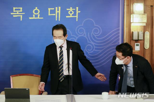 [서울=뉴시스]김병문 기자 = 정세균 국무총리가 28일 오후 서울 종로구 총리공관에서 '코로나19 영업 손실보장, 제도화 방안' 주제로 열린 제34차 목요대화에 참석하고 있다. (공동취재사진) 2021.01.28. photo@newsis.com