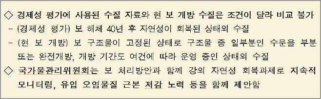 - 결국 경제성 평가에서 예측한 수질은 현 보 개방* 수질과는 전제조건이 달라 직접 비교는 어려움