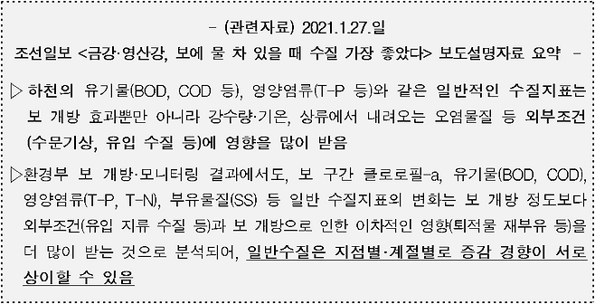 ○ 2021.1.28. 조선일보 <'보 해체' 뒤집힐까봐… 정부, 2년전 수치 갖다 써> 보도에 대하여 다음과 같이 설명드립니다.
