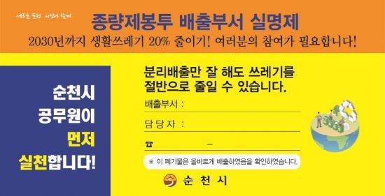 순천시의 산하 부서와 읍·면·동 행정복지센터는 사무실에서 발생하는 생활쓰레기 배출 시 종량제 봉투 앞면에 부서명을 기재한 스티커를 부착한 뒤 쓰레기를 내놓아야 한다.