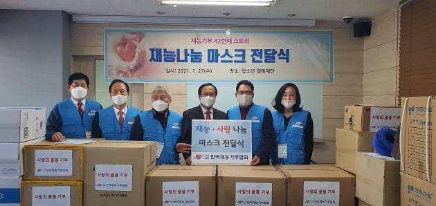 사단법인 한국재능기부협회(이사장 최세규)는 지난 27일 서울시 서초구 청소년 행복재단에 마스크와 베개 등 생활용품 전달했다. 이날 전달식 참석한 김일순 도부마스크 회장과 노철래 전 국회의원, 강철수 와우쇼핑몰 상가번영회 회장, 이동령 에스엠텍 이사 등은 후원금과 KF94 마스크를 지원했다. 이점용 용문전력 대표과 최현순 대한민국 천연염색명인협회 이사장, 박승 전 한국은행 총재, 고정용 아이젠파마코리아 대표, 이기식 효성이엔지 대표, 김승기 한은이앤씨 부장, 이상덕 한일교역 대표, 박민수 샹스 대표, 전여원 호크 대표 등은 후원금을 보탰다. 국내 최대규모 K-방역 컨소시엄 구축과 공간살균기 판매 랜털 서비스를 제공하고 있는 이투피코리아의 원재희 대표와 최철환 영인산업 하모니헬스케어 회장, 황재희 라우건설 대표, 임도현 해광리테일 대표, 김경은 현대HCN동작방송중앙센터 동명텔레콤 대표, 김성수 한국농식품6차산업협회 회장, 김용우 지라이프 대표는 KF-94 마스크를, 원세연 여우락예술단 대표는 메모리폼 목베개를 각각 지원했다.