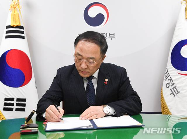 [서울=뉴시스]박민석 기자 = 홍남기 경제부총리 겸 기획재정부 장관이 28일 서울에서 '한-우즈베키스탄 정부 간 대외경제협력기금(EDCF) 기본약정'에 서명하고 있다. (사진=기획재정부 제공) 2021.01.28. photo@newsis.com