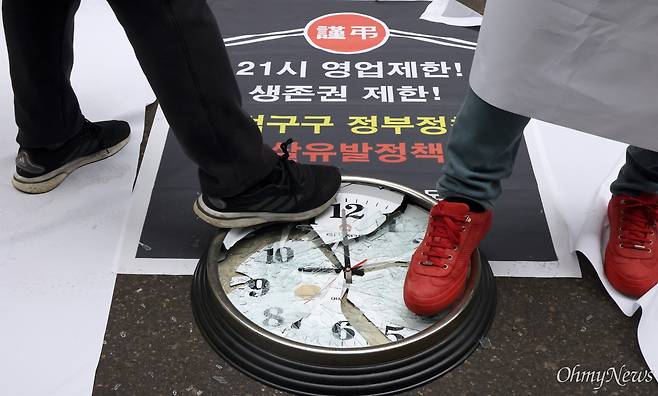 | ▲ 음식점, 호프집을 운영하는 자영업자들이 지난 15일 오후 서울 영등포구 더불어민주당 당사 앞에서 기자회견을 열어 코로나19 방역 조치에 따른 정부의 영업시간 제한에 항의하며 형평성 있고 합리적인 방역기준 수립해 달라고 요구하고 있는 모습. |