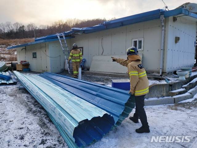 이날 오후 4시20분께 충주시 살미면 설운리에서 샌드위치 패널 건물 지붕이 날아가 소방당국이 안전 조치를 했다.
