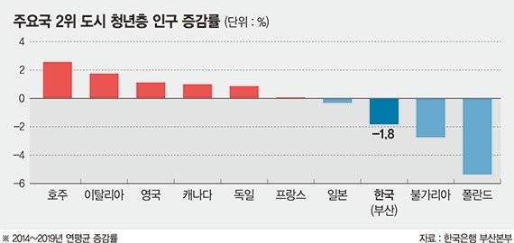 일자리를 찾아 떠나는 청년들이 늘면서 2007∼2018년 비수도권 대학 졸업생의 26.8%가 졸업 후 수도권 일자리로 진입했다. 부산의 청년층 인구 역시 2014~2019년 1.8% 감소했다.