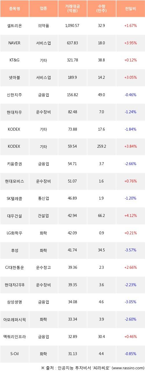 셀트리온, NAVER, KT&G 등은 전일 대비 주가가 상승했고, 신한지주, 현대차우, KODEX 200 등은 주가가 하락했다.