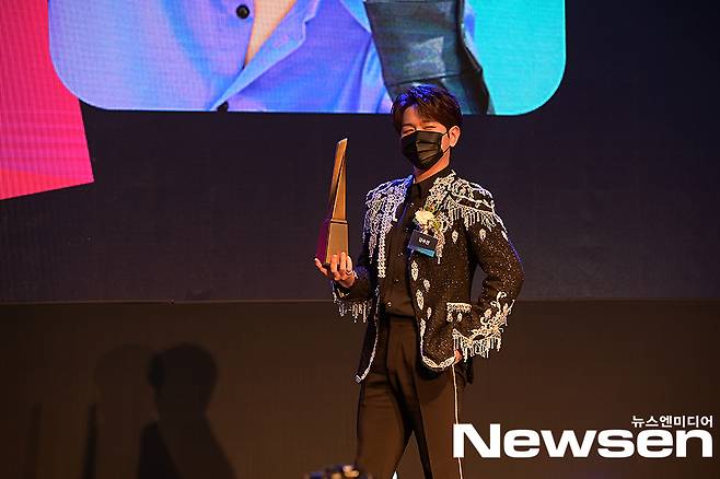 이날 가수 김수찬이 시상식에 참석해 트롯테이너 부문을 수상하고 있다. (사진제공=한국소비자포럼)