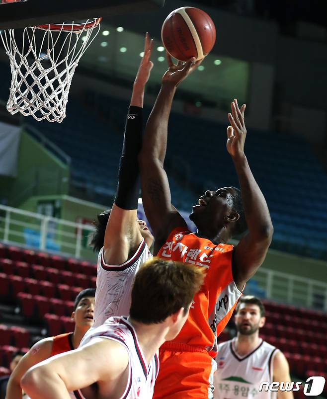 (인천=뉴스1) 정진욱 기자 = 28일 오후 인천 삼산월드체육관에서 열린 프로농구 '2020-2021 현대모비스 KBL' 인천 전자랜드와 고양 오리온의 경기에서 전자랜드 헨리 심스가 슛을 하고 있다. 2021.1.28/뉴스1