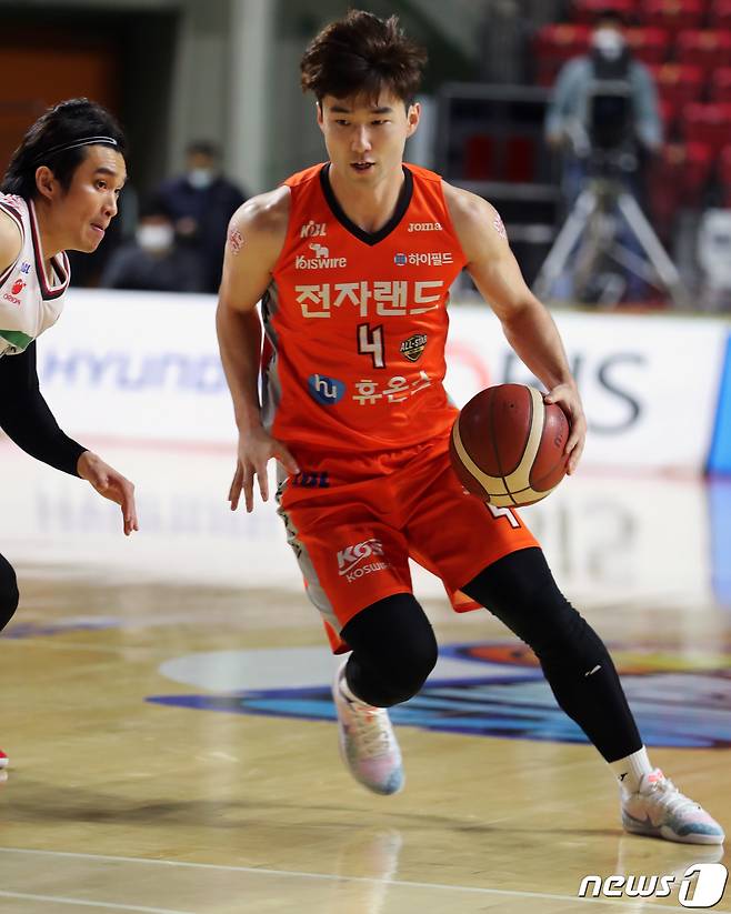 (인천=뉴스1) 정진욱 기자 = 28일 오후 인천 삼산월드체육관에서 열린 프로농구 '2020-2021 현대모비스 KBL' 인천 전자랜드와 고양 오리온의 경기에서 전자랜드 김낙현이 드리블을 하고 있다. 2021.1.28/뉴스1