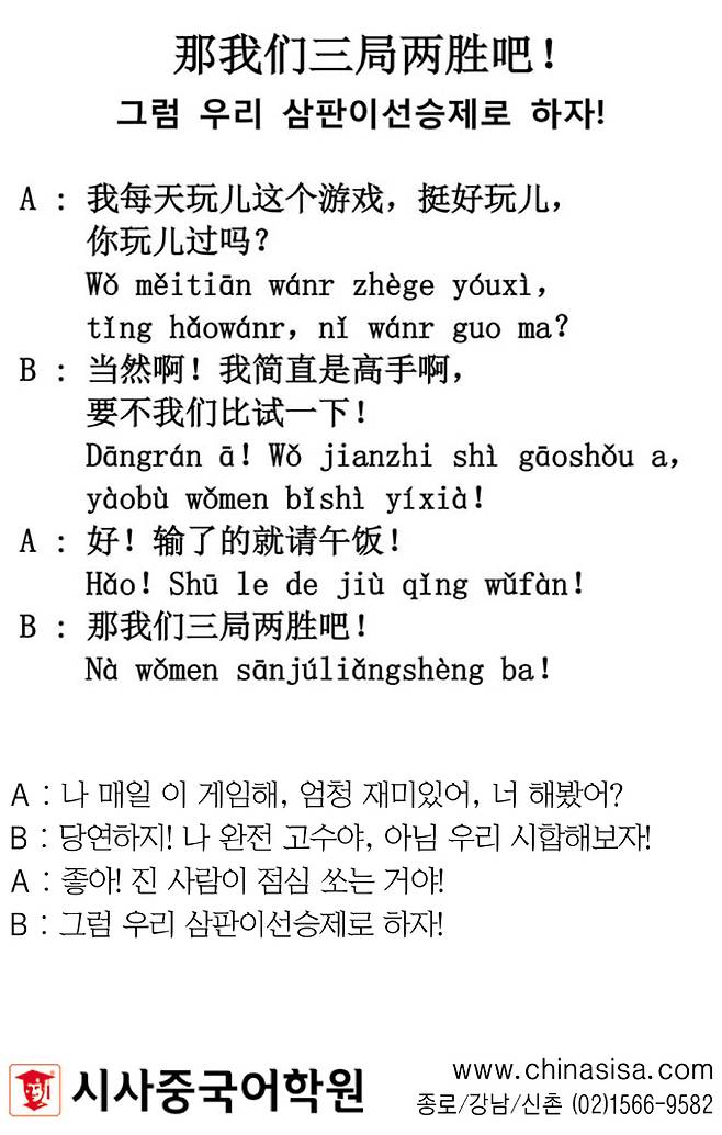 [시사중국어학원의 리얼 중국어 회화] 그럼 우리 삼판이선승제로 하자!