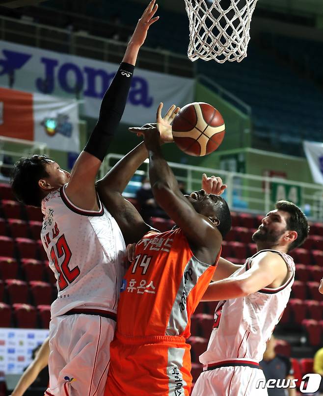 (인천=뉴스1) 정진욱 기자 = 28일 오후 인천 삼산월드체육관에서 열린 프로농구 '2020-2021 현대모비스 KBL' 인천 전자랜드와 고양 오리온의 경기에서 양팀 선수들이 리바운드를 시도하고 있다. 2021.1.28/뉴스1