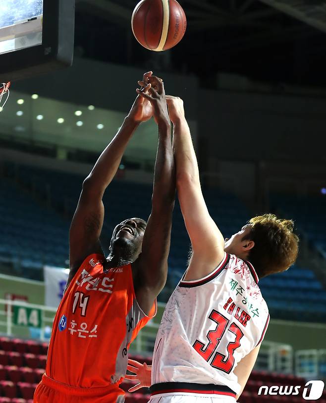 (인천=뉴스1) 정진욱 기자 = 28일 오후 인천 삼산월드체육관에서 열린 프로농구 '2020-2021 현대모비스 KBL' 인천 전자랜드와 고양 오리온의 경기에서 양팀 선수들이 리바운드를 시도하고 있다. 2021.1.28/뉴스1
