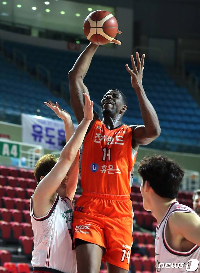 (인천=뉴스1) 정진욱 기자 = 28일 오후 인천 삼산월드체육관에서 열린 프로농구 '2020-2021 현대모비스 KBL' 인천 전자랜드와 고양 오리온의 경기에서 전자랜드 헨리 심스가 리바운드를 하고 있다.2021.1.28/뉴스1