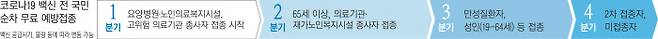 예방접종 순서는 감염 시 중증 진행 위험, 의료·방역체계 유지, 코로나19 전파 특성 등을 고려했다. 우선 코로나19 환자를 치료하는 병원 종사자 4만9000명, 요양병원 입소·종사자 78만명, 고위험 의료기관 종사자 44만명 등 130만명을 1분기 내에 접종한다. 노인·장애인·노숙인 등 취약시설 입소자 90만명과 65세 이상 노인 850만명 등 약 900만명을 2분기 내 접종키로 했다. 국내 첫 접종은 국립중앙의료원(중앙감염병전문병원)에 마련된 중앙예방접종센터에서 수도권 소재 의료기관 의료진을 대상으로 실시한다. 일반 시민(성인)과 군·경찰·소방 등 사회 기반시설 종사자 접종은 3분기부터 시작된다.