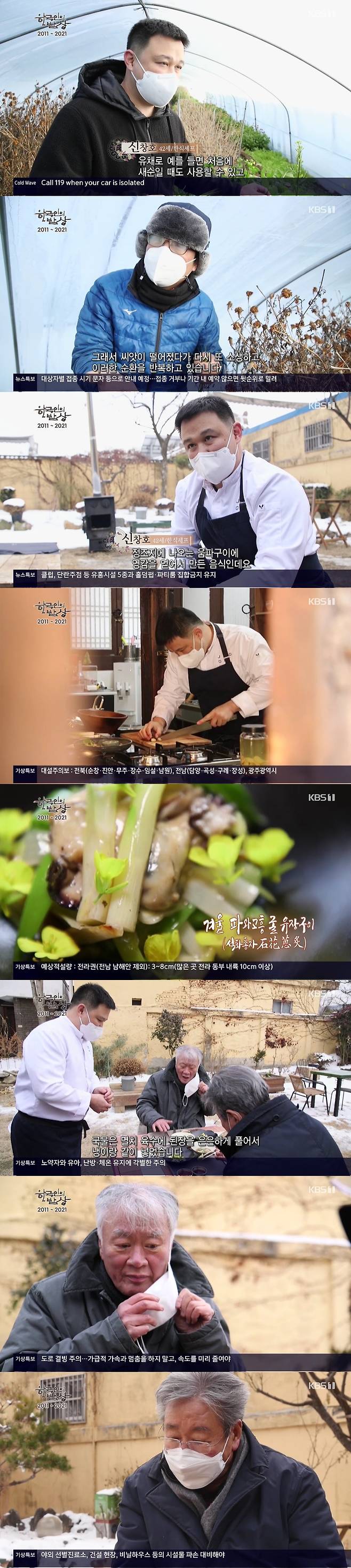 한편, 김훈과 최불암은 신창호 셰프가 직접 만든 ‘겨울 파와 유자구이’를 시식하는 시간을 가졌다. 최불암은 “한국음식이 이렇게 아름다울 수 있는지 너무 예쁘다”라며 그 비주얼에 감탄을 쏟았다. 음식을 맛본 김훈 작가는 불맛 나는 파와 더불어서 냉이를 넣은 된장국을 먹고 역시 감탄했다.