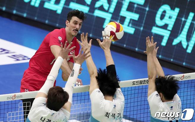 (수원=뉴스1) 조태형 기자 = 28일 오후 경기도 수원시 장안구 수원실내체육관에서 열린 도드람 2020-2021 V-리그 남자부 한국전력과 우리카드의 경기, 한국전력 러셀이 우리카드 블로커 앞에서 공격하고 있다. 2021.1.28/뉴스1