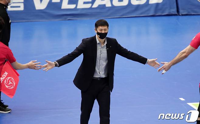 (수원=뉴스1) 조태형 기자 = 28일 오후 경기도 수원시 장안구 수원실내체육관에서 열린 도드람 2020-2021 V-리그 남자부 한국전력과 우리카드의 경기, 한국전력 장병철 감독이 선수들과 기쁨을 나누고 있다. 2021.1.28/뉴스1