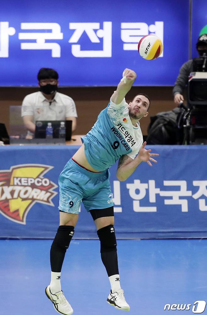 (수원=뉴스1) 조태형 기자 = 28일 오후 경기도 수원시 장안구 수원실내체육관에서 열린 도드람 2020-2021 V-리그 남자부 한국전력과 우리카드의 경기, 우리카드 알렉스가 서브하고 있다. 2021.1.28/뉴스1