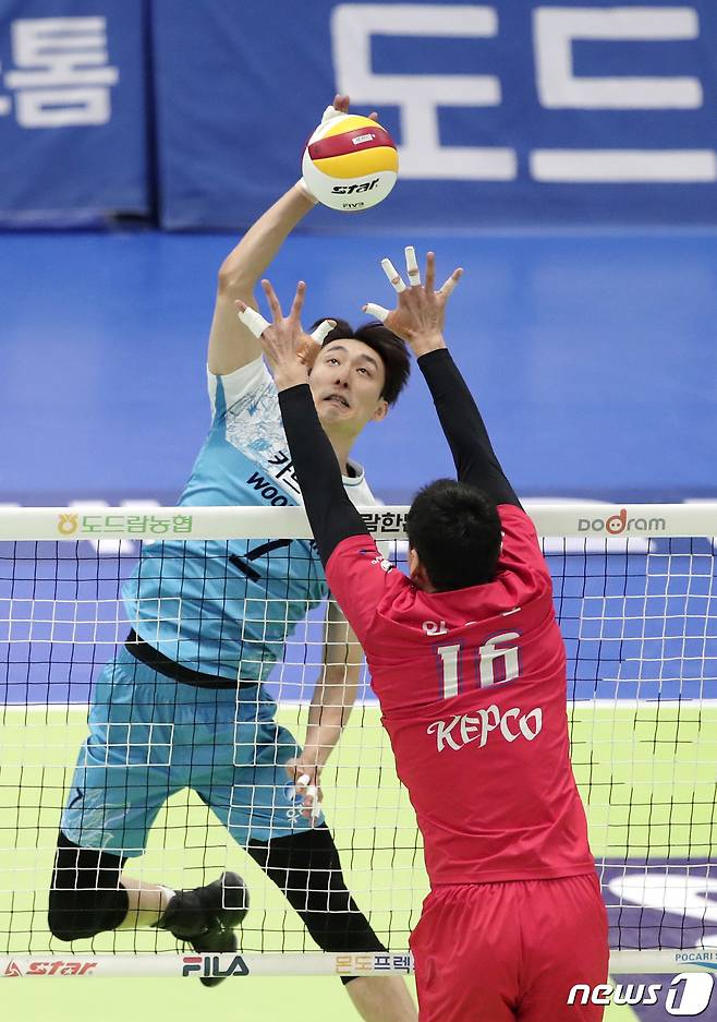 (수원=뉴스1) 조태형 기자 = 28일 오후 경기도 수원시 장안구 수원실내체육관에서 열린 도드람 2020-2021 V-리그 남자부 한국전력과 우리카드의 경기, 우리카드 하현용이 공격하고 있다. 2021.1.28/뉴스1
