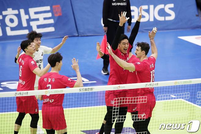 (수원=뉴스1) 조태형 기자 = 28일 오후 경기도 수원시 장안구 수원실내체육관에서 열린 도드람 2020-2021 V-리그 남자부 한국전력과 우리카드의 경기, 한국전력 선수들이 기쁨을 나누고 있다. 2021.1.28/뉴스1