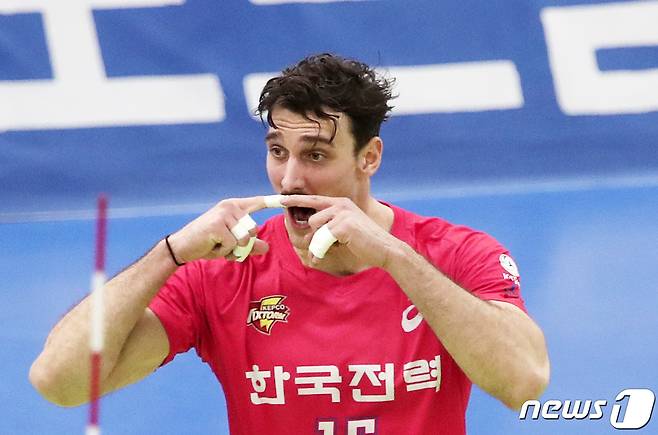(수원=뉴스1) 조태형 기자 = 28일 오후 경기도 수원시 장안구 수원실내체육관에서 열린 도드람 2020-2021 V-리그 남자부 한국전력과 우리카드의 경기, 한국전력 러셀이 득점 후 세리머니를 하고 있다. 2021.1.28/뉴스1