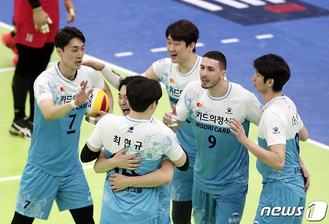 (수원=뉴스1) 조태형 기자 = 28일 오후 경기도 수원시 장안구 수원실내체육관에서 열린 도드람 2020-2021 V-리그 남자부 한국전력과 우리카드의 경기, 우리카드 선수들이 기쁨을 나누고 있다. 2021.1.28/뉴스1