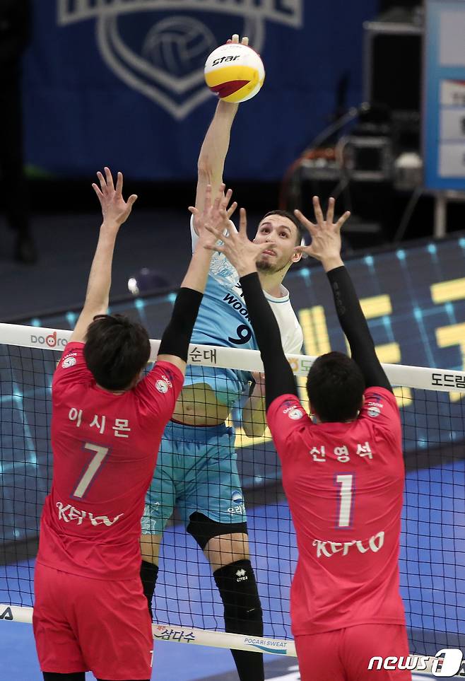 (수원=뉴스1) 조태형 기자 = 28일 오후 경기도 수원시 장안구 수원실내체육관에서 열린 도드람 2020-2021 V-리그 남자부 한국전력과 우리카드의 경기, 우리카드 알렉스가 한국전력 블로커 앞에서 공격하고 있다. 2021.1.28/뉴스1