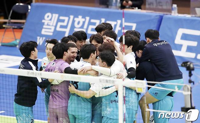 (수원=뉴스1) 조태형 기자 = 28일 오후 경기도 수원시 장안구 수원실내체육관에서 열린 도드람 2020-2021 V-리그 남자부 한국전력과 우리카드의 경기, 승리한 우리카드 선수들이 기쁨을 나누고 있다. 2021.1.28/뉴스1