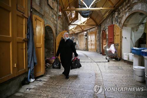 epa08971084 A view of empty street and closed shops in one of the narrow streets in the old city of the West dank town of Hebron, 28 January 2021. EPA/ABED AL HASHLAMOUN