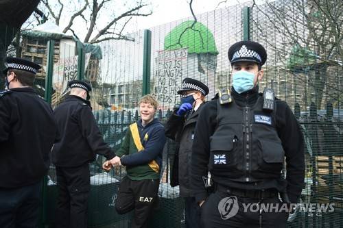 epa08971124 A HS2 Rebellion protester is arrested in Euston Square in London, Britain, 28 January 2021. Police and Enforcement officers have begun to evict clear protesters from HS2 Rebellion from a camp at Euston Square in London. HS2 protesters are demanding an end to High Speed rail developments projects in Britain EPA/NEIL HALL