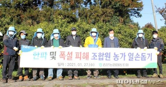 제주 중문농협(조합장 김성범) 임직원 10여명은 지난 27일 언 피해를 입은 감귤농가 수확현장을 찾아 산지 격리 일손돕기에 나섰다.