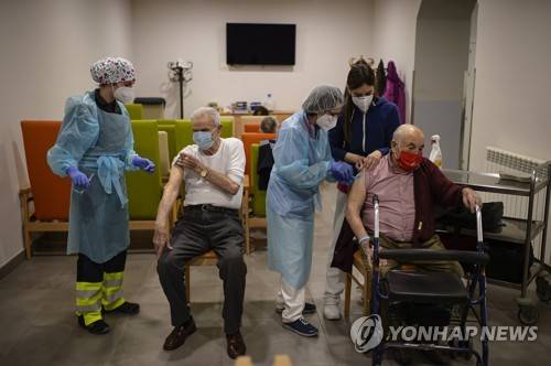 Residents are vaccinated with the second Pfizer coronavirus vaccine at San Jeronimo nursing home, in Estella, around 38 kms (23 miles) from Pamplona, northern Spain, Thursday, Jan. 28. 2021. (AP Photo/Alvaro Barrientos)