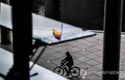 epa08971135 Reflection of German flag as a cyclist rides in the government quarter in Berlin, Germany, 28 January 2021. EPA/FILIP SINGER