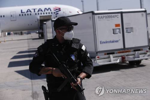 epa08971144 Security members escort shipment of Chinese Sinovac vaccines, at the Santiago Airport, Chile, 28 January 2021. Chile received on 28 January the first shipment with almost 2 million vaccines made by the Chinese pharmaceutical Sinovac, which will be applied to older adults starting on 03 March 2021. EPA/Alberto Valdes