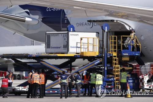 epa08971143 Workers unload Chinese Sinovac vaccines at the Santiago Airport, Chile, 28 January 2021. Chile received on 28 January the first shipment with almost 2 million vaccines made by the Chinese pharmaceutical Sinovac, which will be applied to older adults starting on 03 March 2021. EPA/Alberto Valdes