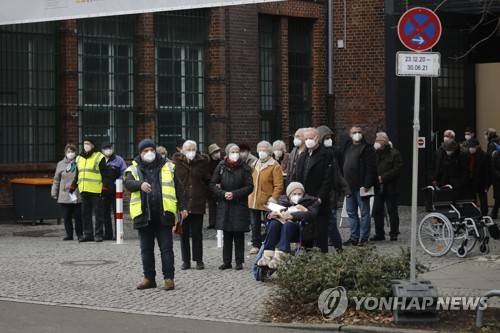 People wait for transportation as they leave the vaccination center against the COVID-19 disease in the district Treptow in Berlin, Germany, Thursday, Jan. 28, 2021. (AP Photo/Markus Schreiber)