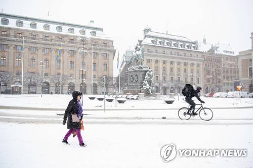 A cyclist crosses Gustav Adolfs Square in Stockholm, during snow fall on Thursday Jan. 28, 2021. (Henrik Montgomery/TT via AP) SWEDEN OUT