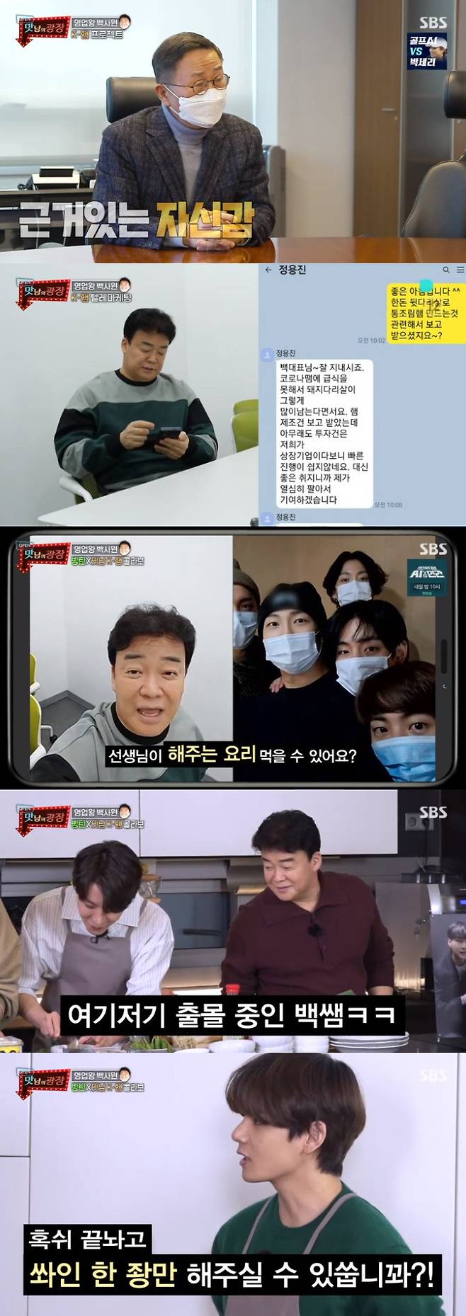 이어 백종원은 방탄소년단 RM에게도 연락을 했다. 마침 방탄소년단 멤버들은 모두 함께 있었다. 백종원은 "우리가 햄을 만들었다. 방탄이 햄을 맛있게 먹는 모습을 보여주면 홍보에 도움이 될 것 같다"고 용건을 설명했다. 이야기를 들은 멤버들은 "선생님이 해주는 요리 먹을 수 있냐"고 물었고 백종원은 "해준다면 내가 가겠다. 맛있게 요리해주겠다"고 약속했다.