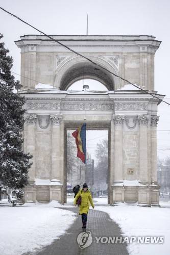 epa08971168 A woman walks on clean way near the Arhc of the Triumph after heavy snowfall in downtown Chisinau, Moldova, 28 January 2021. EPA/DUMITRU DORU