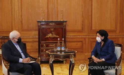 epa08971211 A handout photo made available by the Georgian President's Press Service shows Georgia's President Salome Zourabichvili (R) meets with Iranian Foreign Minister Mohammad Javad Zarif (L) in Tbilisi, Georgia, 28 January 2021. Iranian Foreign Minister Mohammad Javad Zarif is on a working visit to Georgia. EPA/GEORGIAN PRESIDENT PRESS SERVICE/HANDOUT HANDOUT EDITORIAL USE ONLY/NO SALES