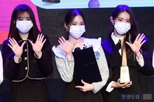 그룹 위클리 조아, 이수진, 먼데이가 28일 오후 서울 여의도 콘래드호텔에서 열린 '2021 대한민국 퍼스트브랜드 대상 시상식'에서 신인 여자아이돌 부문을 수상한 후 포토타임을 갖고 있다.