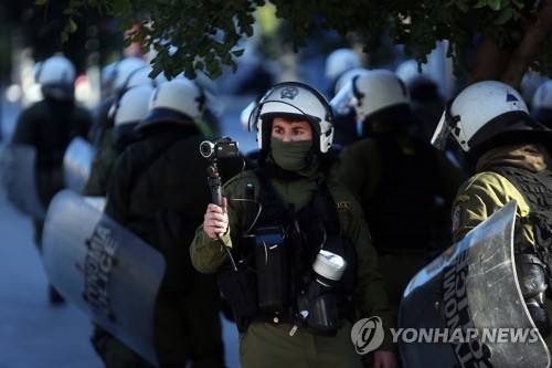 epa08971215 A riot policeman films university and high school students as they attend a protest against the education ministry's new bill in central Athens, Greece, 28 January 2021. Students and professors protested against proposals for a university police force, changes in the system for admission to higher education and a number of other issues. EPA/ORESTIS PANAGIOTOU
